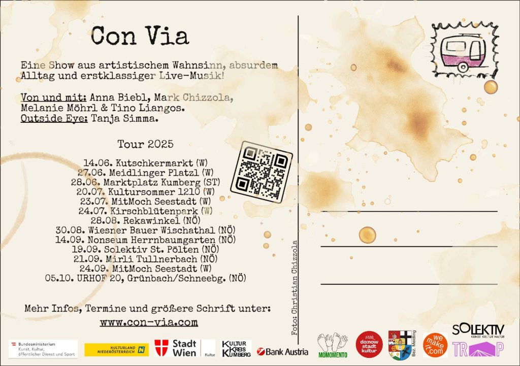 Con Via steht für zeitgenössischen Zirkus mit Humor, Poesie und Live-Musik. Die Tour gastiert 2025 an mehreren Orten in Niederösterreich und Wien – darunter auch unser Hof in Wischathal.